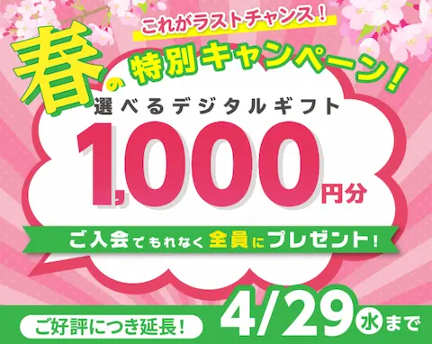 - デジタルギフト1,000円分プレゼント(~4/29まで)