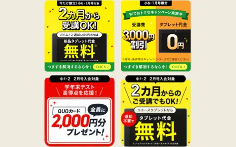 | 中学1年生 | ・QUOカード2,000円分 ・2か月から受講OK! ※リユースタブレットなら機器代金無料 2月号入会者対象 |