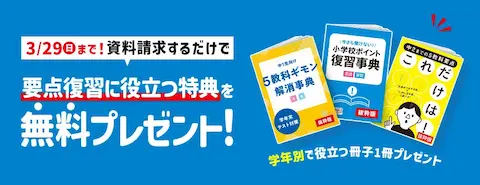 例えば2026年3月時点の例でいうと、資料請求をすると「要点復習に役立つ冊子(学年別)」が無料でもらえるキャンペーン。